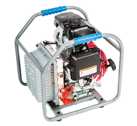符合國家標(biāo)準(zhǔn)GB/T17906-1999《液壓破拆工具通用技術(shù)條件》,機(jī)動泵的總質(zhì)量23.6kg,機(jī)動泵對工具進(jìn)行密封性能試驗(yàn),工具閉合或全開狀態(tài),在63MPa條件下,應(yīng)無液壓油泄漏。機(jī)動泵額定工作壓力63MPa,高壓流量0.4L/min,低壓工作壓力10 MPa,低壓流量1.3 L/min。