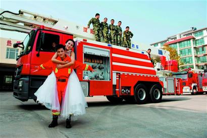 身著消防服和穿著潔白婚紗的一對(duì)新人以登高車、訓(xùn)練塔、搜救犬等為背景,那些曾經(jīng)號(hào)稱時(shí)尚、古典、樸素、奢華的最美婚紗照們,在這一刻被徹底的秒殺了,就是依靠這些簡(jiǎn)單元素使一對(duì)新人一下子“火”了。