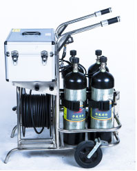 • 組成部件:長管推車、長管繞盤裝置、氣瓶、氣源分配器、減壓器、壓力顯示裝置、長管、面罩、供氣閥、便攜式腰帶。